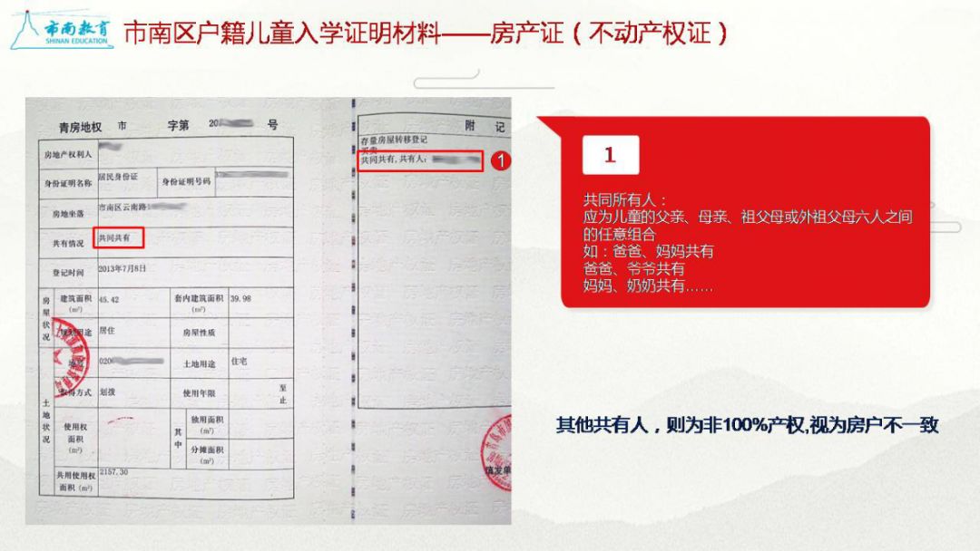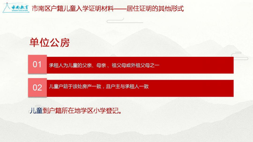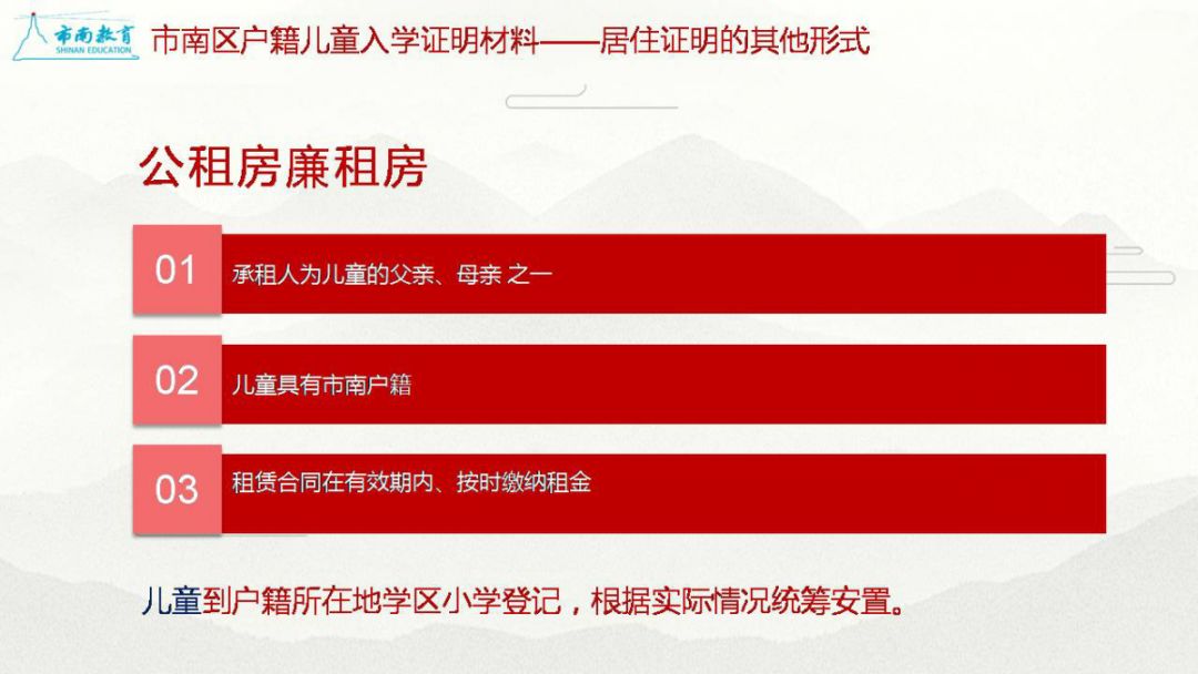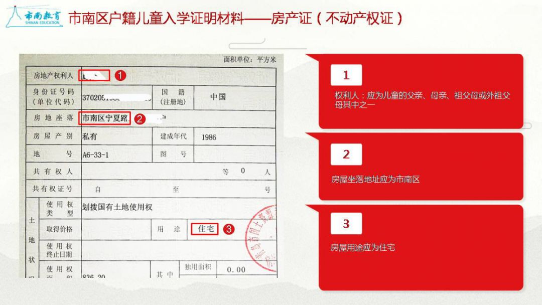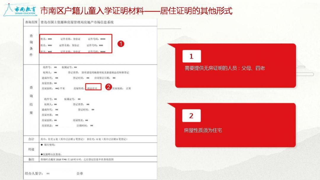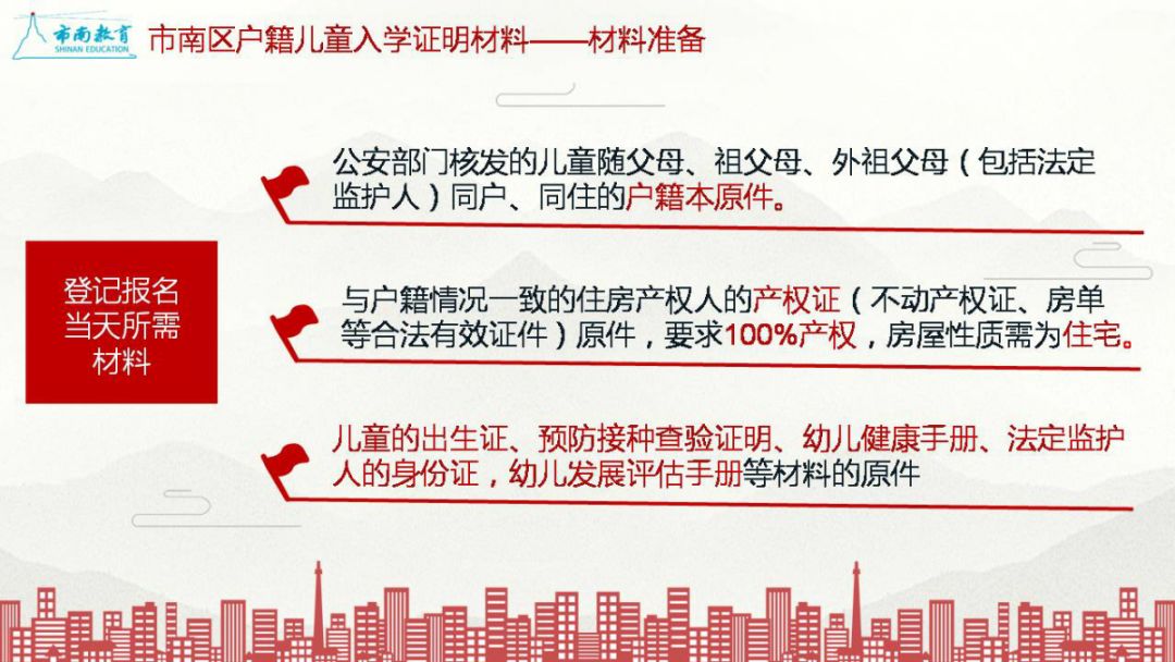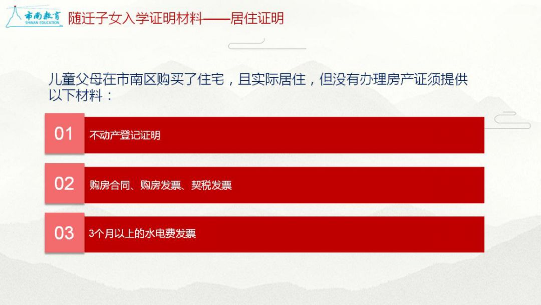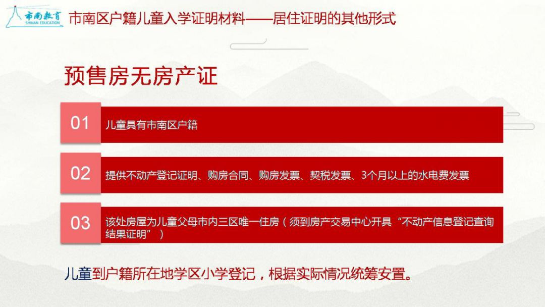 1.关于入学报名其他辅助材料的提供:如适龄儿童的户口本无法证明儿童与户主或房屋产权人的关系,或者其他特殊情况,适龄儿童法定监护人还需要提供结婚证、出生证等能证明相应关系的材料。如适龄儿童父母在市南区购买了住宅,且实际入住,但未办理房产证等特殊情况,还需要适龄儿童法定监护人提供以下材料补充:(1)不动产交易登记信息查询结果证明;(2)购房合同、购房发票、契税发票;(3)3个月以上的水电费发票。
