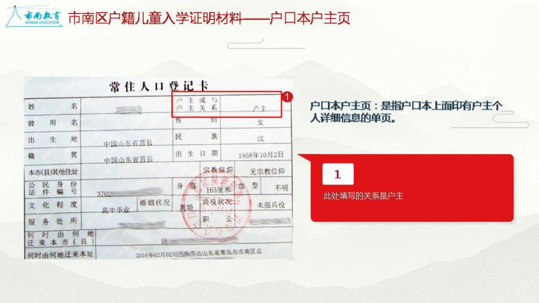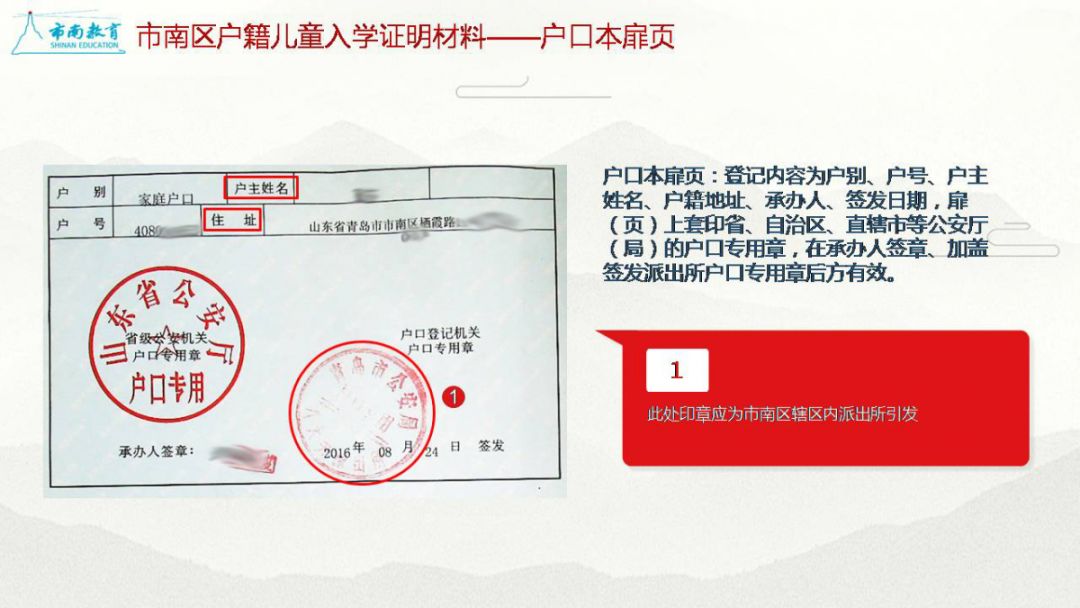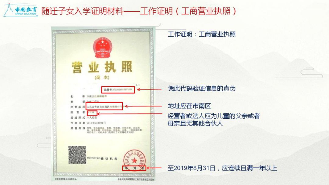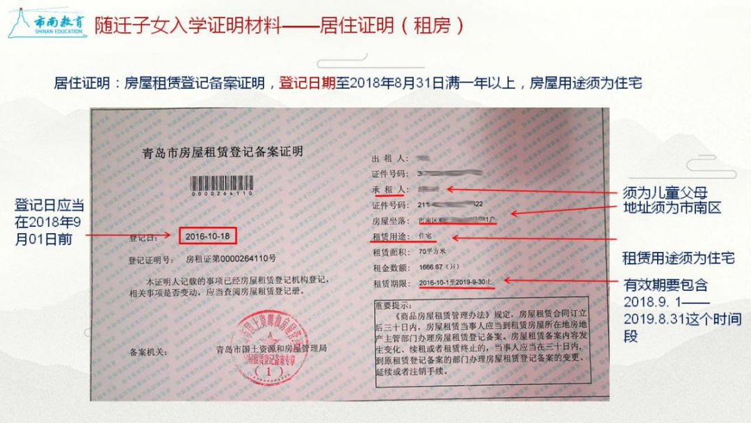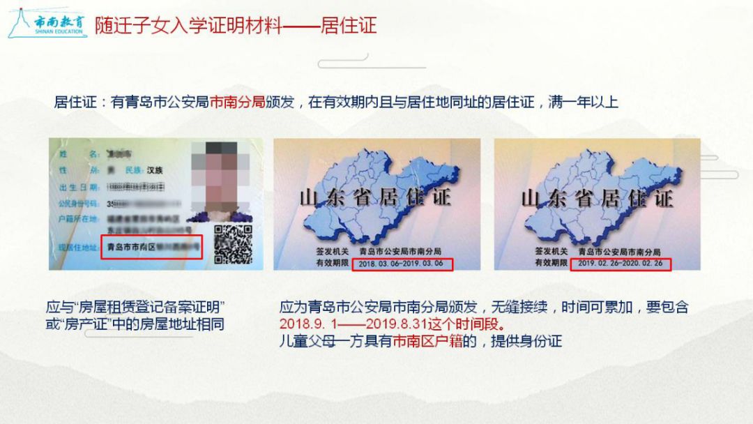 1.随迁子女适龄入学,法定监护人的居住证和工商营业执照(或劳动合同)需提供同属一方的材料。若随迁子女父母一方为外来务工,另一方为市南户籍,或者适龄儿童父母双方均为市南户籍,但该儿童为外地户籍,可提供父母一方在市南区的户籍、住房、工作等相关材料。(黄岛区、城阳区、崂山区、即墨区来市南区务工人员不属青岛市流动人口,无需办理居住证)