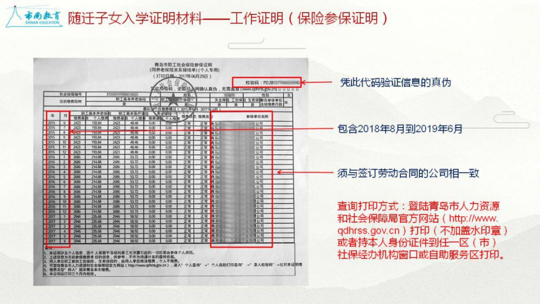 合法就业的:提供适龄儿童父母一方的青岛市人力资源和社会保障局印制的劳动合同正规文本、社保卡及青岛市职工社会保险参保证明;合法经营的:提供适龄儿童父母一方的市南区工商营业执照(在有效期内且截至2019年8月31日满一年)。