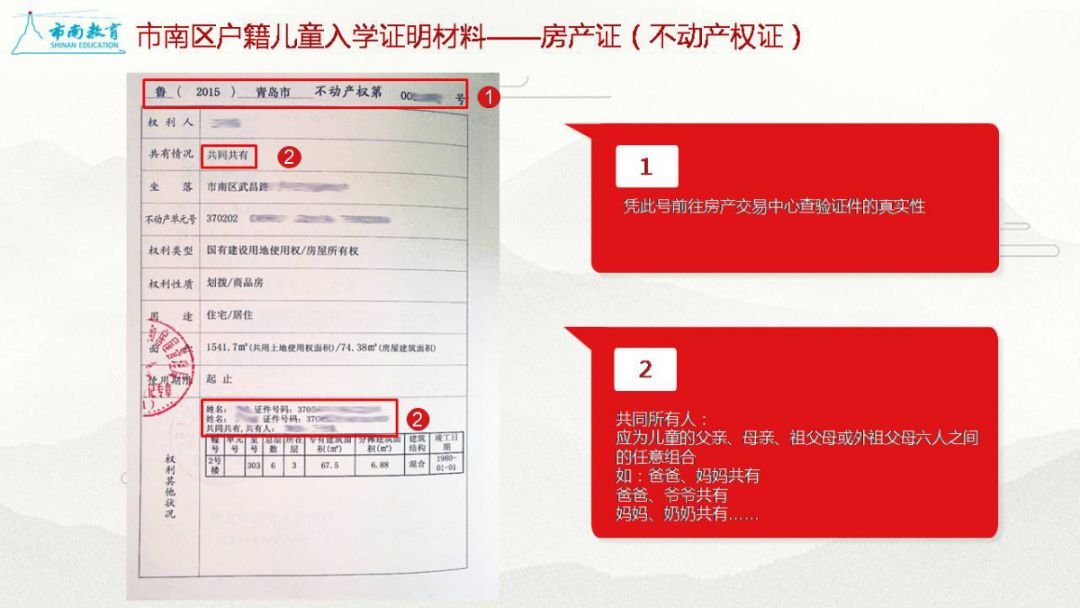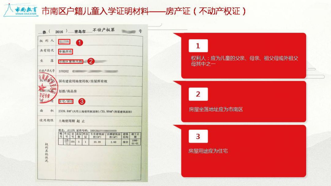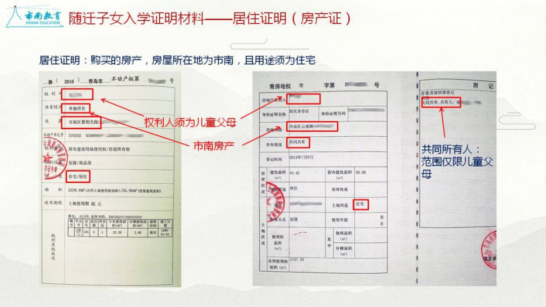 适龄儿童父母房屋产权证(100%产权)(尚未办理房产证的,出具购房合同、购房发票、契税发票以及入住后缴纳3个月以上水电费发票)或由青岛市国土资源与房屋管理局验印的、在有效期内且截至2019年8月31日,登记日和租赁期均满一年住宅房屋的《青岛市房屋租赁登记备案证明》。