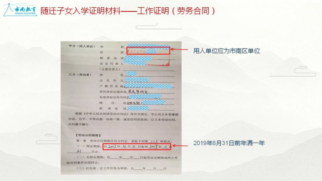 2.父母至少一方与市南区用人单位签订劳动合同或办理市南工商营业执照,并在市南区务工一年以上;