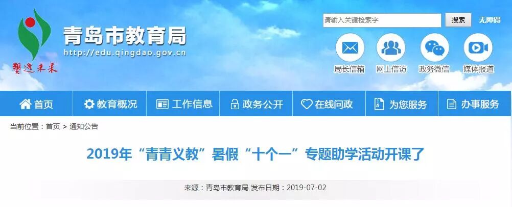 为贯彻落实《青岛市促进中小学生全面发展“十个一”项目行动计划》相关要求,服务学生成长。市教育局将7月6日至7月28日组织开展“青青义教”暑假“十个一”专题助学活动。