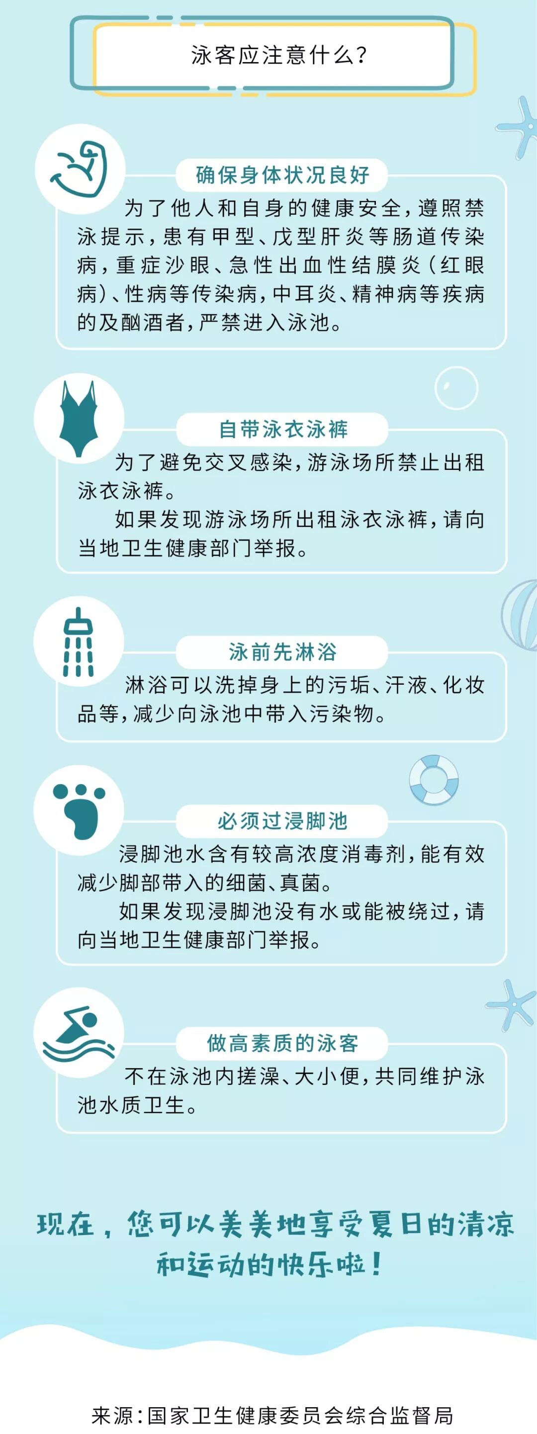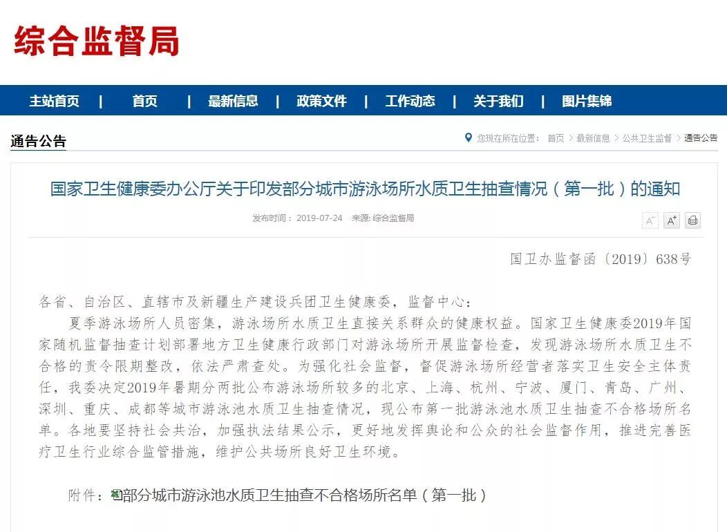 夏季游泳场所人员密集,游泳场所水质卫生直接关系群众的健康权益。本次通知中提到,国家卫生健康委2019年国家随机监督抽查计划部署地方卫生健康行政部门对游泳场所开展监督检查,并决定2019年暑期分两批公布游泳场所较多的北京、上海、杭州、宁波、厦门、青岛、广州、深圳、重庆、成都等城市游泳池水质卫生抽查情况。