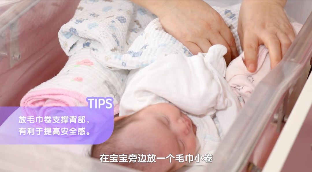 在宝宝旁边放一个毛巾小卷,既令宝宝有安全感,也可以支撑他的背部。
