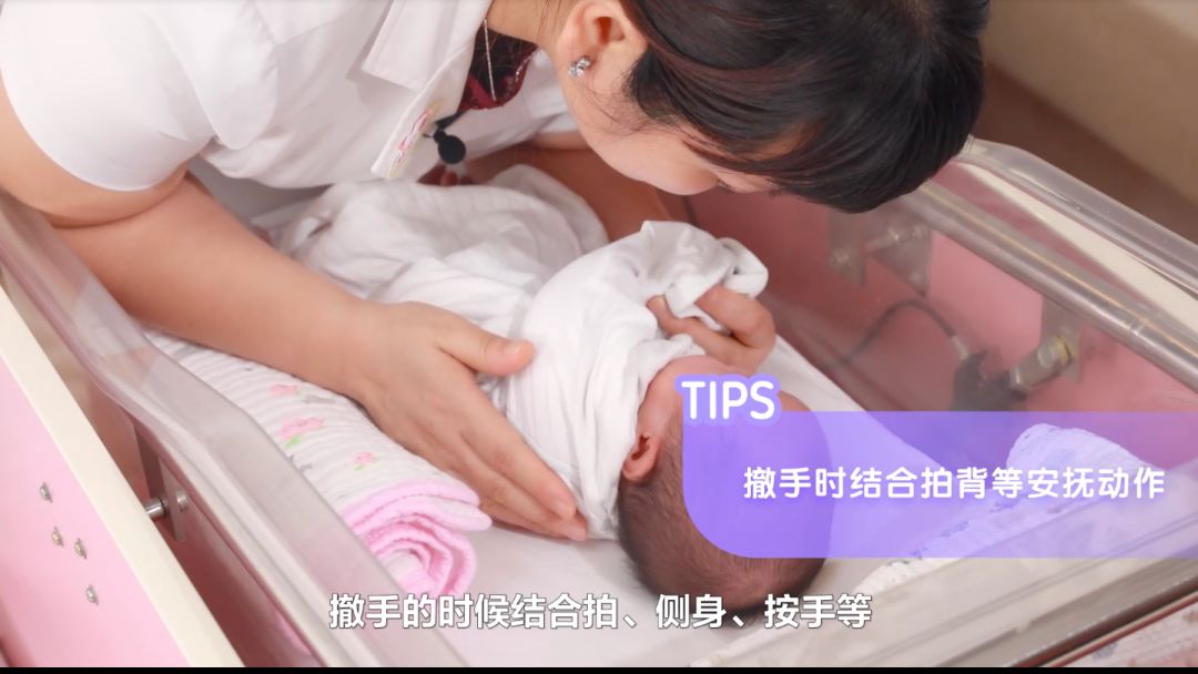 撤手的时候结合拍、侧身、按手等辅助安抚动作。