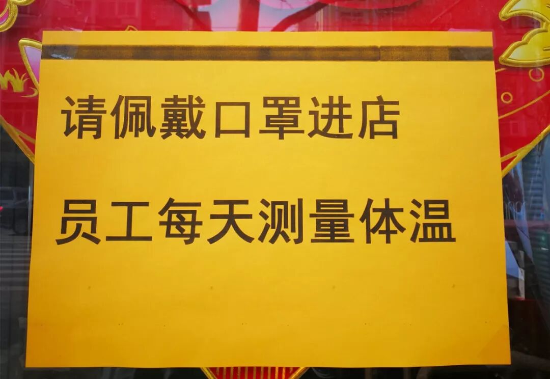 少数几家还在营业的基本都会在店门前张贴出:佩戴口罩方能进店的提示,有的商家还鼓励顾客自带餐具打包回家吃。