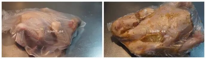鸡去头去屁股去脚,在肚内放入一片姜,腋下各放一片,放入保鲜袋,倒入调味酱汁,摇晃均匀,入冰箱腌制十小时以上。