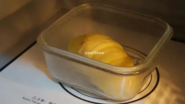 土豆直接烤的话可能要烤45分钟口感才够酥糯,太费时间了,所以先微波炉叮三到五分钟。适大小而定,我这个土豆叮了四分半。
