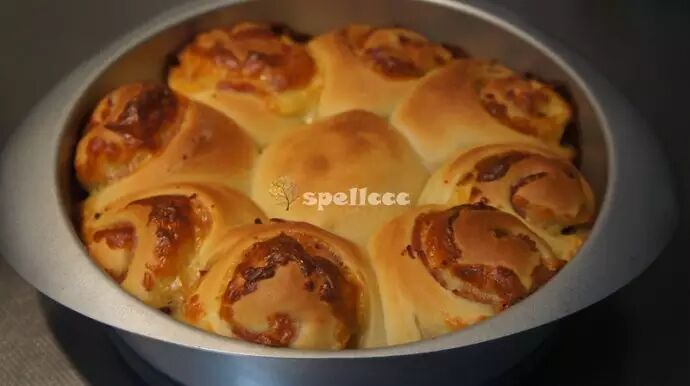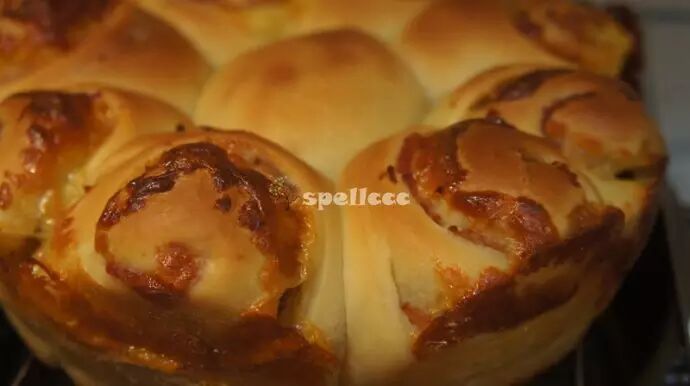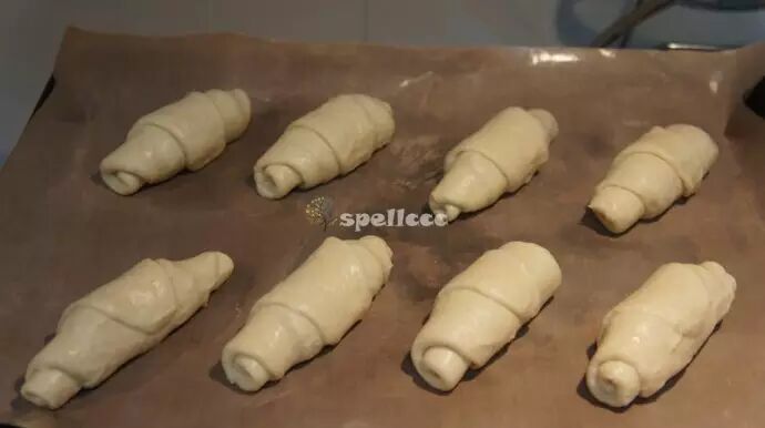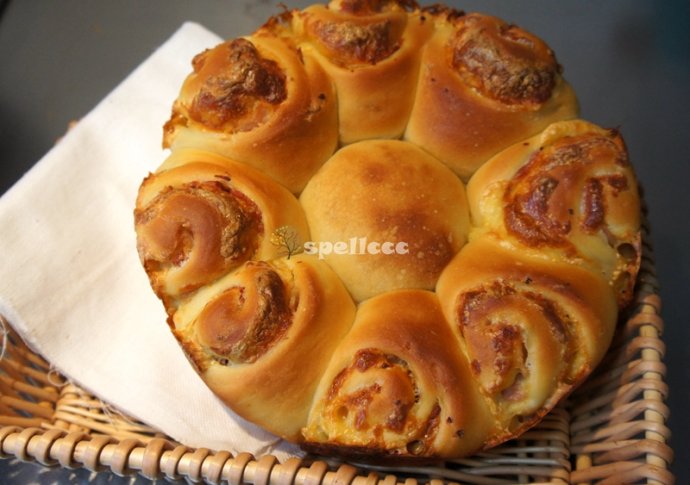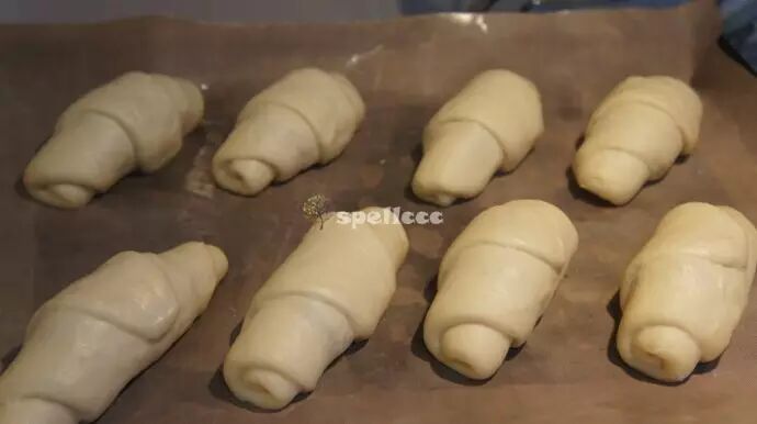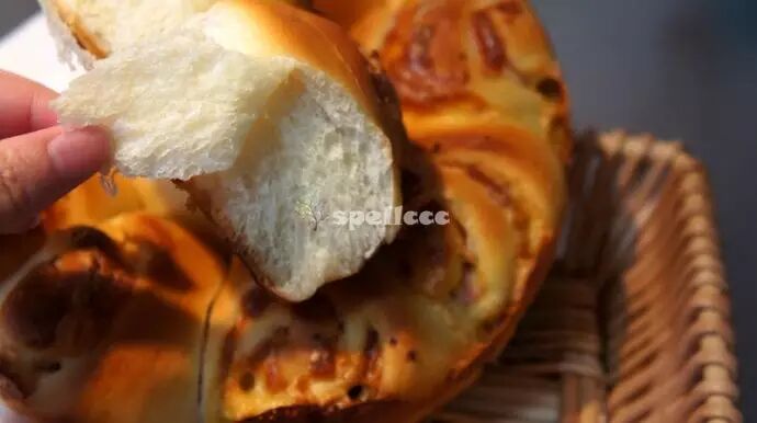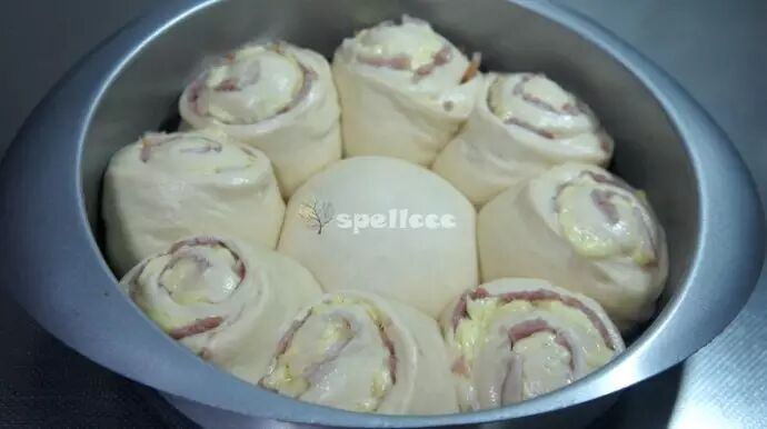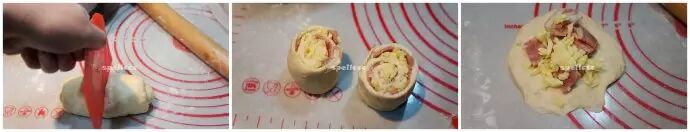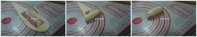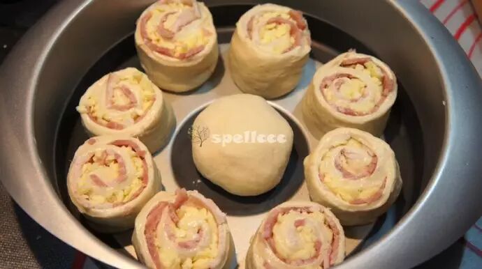 如果没有什么8寸6寸的模具,完全可以做简易的培根小卷,方子和上面的差不多,如何造形看图就能明白。