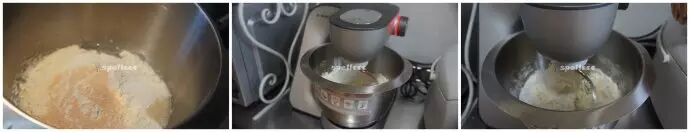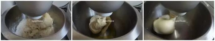 将除橄榄油以外全部倒入,开始揉面。揉后光滑面团后倒入橄榄油继续揉。