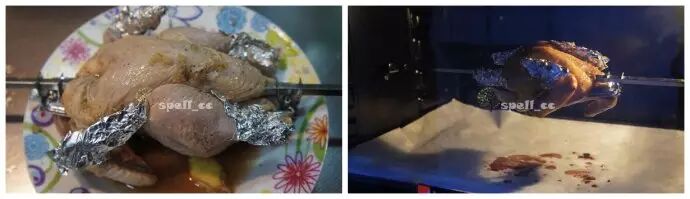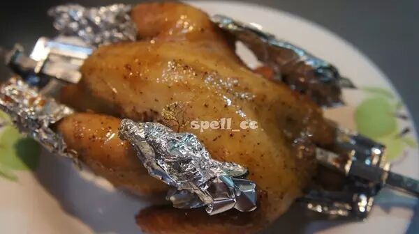 腌制好后固定在烤叉上,烤前在四肢上包上锡纸,否则会烤焦。