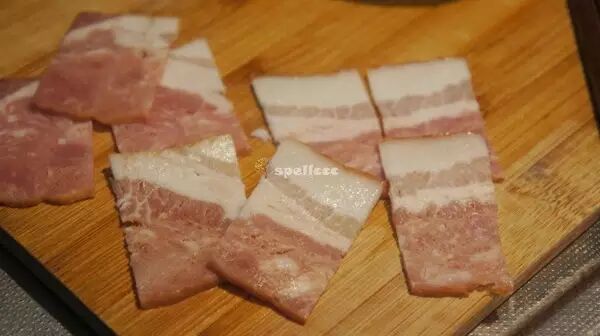 我当时做的时候没有把培根切开,建议还是切成一段段的比较好。不用太碎,一根切三四段就好。