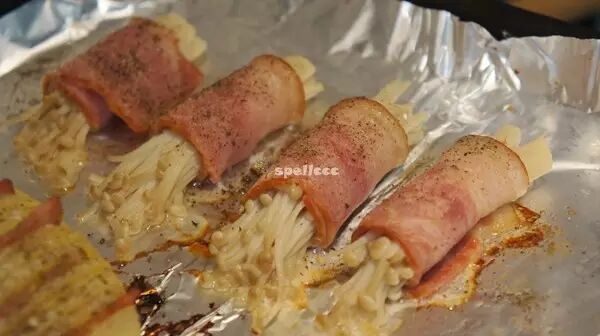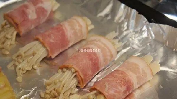 分开金针菇,培根卷起。培根本身的油脂,不用更抹油。