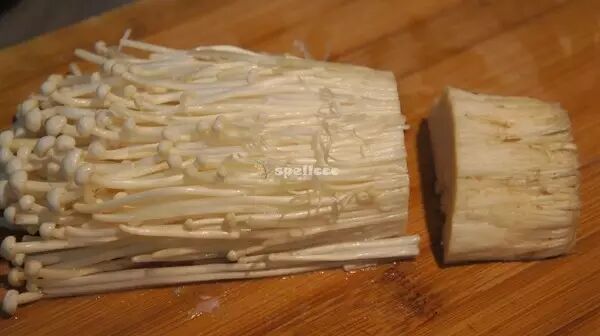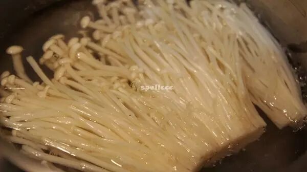 在煮沸的水里焯一下,水里放些盐,让金针菇带点咸味。