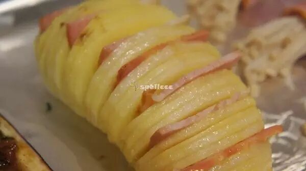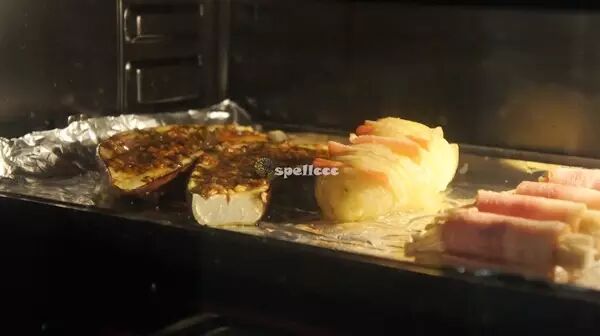 培根切片,切得稍许有大有小一些,小的放在土豆边上,大的放在中间。