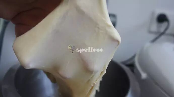 大家都知道做面包的面团要揉到一抻开会有一层薄而不易破的膜。我以前追求的重点往往是“薄”,做多了才知道,“不易破”比“薄”更重要,只有“不易破”,在面团发酵至2倍、高温烘烤时又涨一倍的情况下,它的内部组织才撑得起来。这和面粉质量、水量有较大关系,同时,功率小的揉面机(如一般的面包机),即使揉了四五十分钟,可能可以出现薄膜,但非常易破,再揉下去可能就会揉过头了,这时就需要将面团取出做一些摔打动作,这样会使面团的膜“结实”起来。功率大的厨师机一般没有这个问题,因为力道大,形成“薄而不易破”的膜较容易。