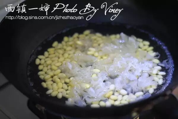 2、锅中倒入纯净水,然后先放黄豆开火煮熟,煮的差不多的时候放入银耳稍微煮一下即可。