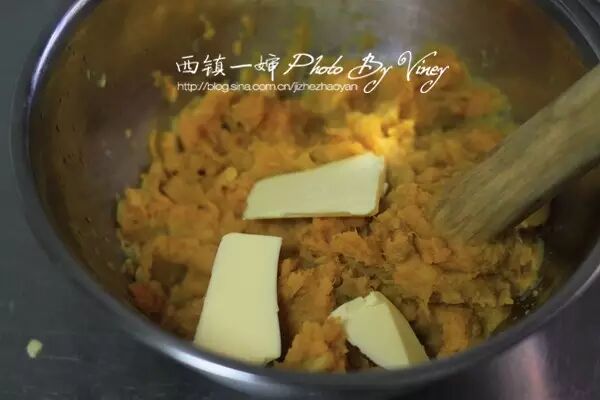 3、之后放入黄油,地瓜泥的热度会让黄油渐渐融化,尽情搅拌吧,让黄油与地瓜泥充分融合。