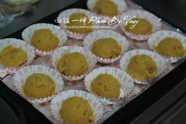 7、手上套塑料手套,或者干脆用勺子,将地瓜泥舀入纸杯蛋糕模中,弄成一个球形。我是用的挖冰淇淋的那种圆勺。