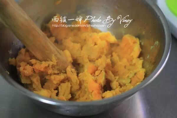 2、用擀面杖的一段趁热将地瓜压成泥。