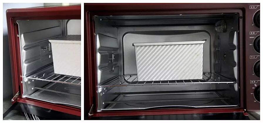 看,这是一个450克的标准土司盒,我说的放中层烘烤,就是这个样子啦。照片拍的角度有限,实际看,土司盒离上下加热管的距离是差不多的,这样就能很均匀的加热了。从卡槽位置来看,是放在了最底下的那个上呦。如果换了蛋糕或者最扁的饼干,放的位置也要灵活调整,总之就是要让糕点距离上下管的位置差不多,才能最大限度的受热均匀。